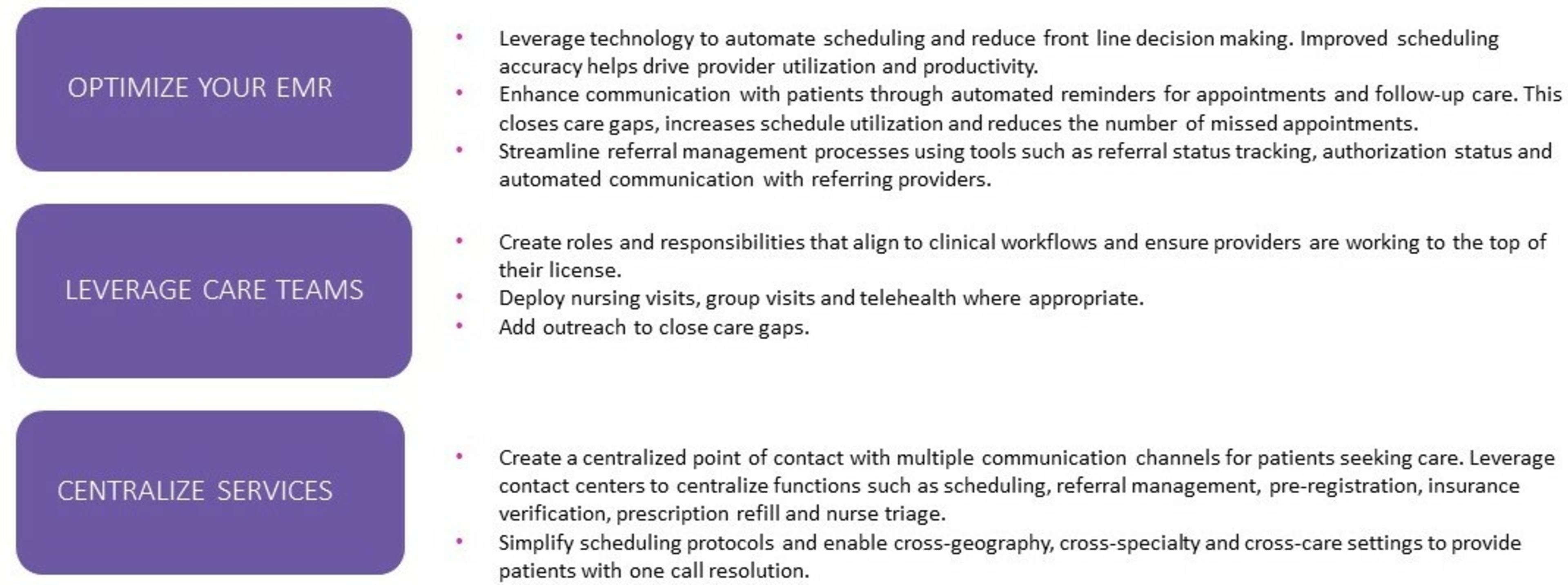Patient access refers to the process of allowing patients to schedule appointments, access medical records and communicate with their healthcare providers. It’s a critical component of care delivery that can positively or negatively impact patient outcomes and the long-term success of providers. Three ways to boost patient access and retention efforts include optimizing the electronic medical record (EMR), leveraging care teams and centralizing services.