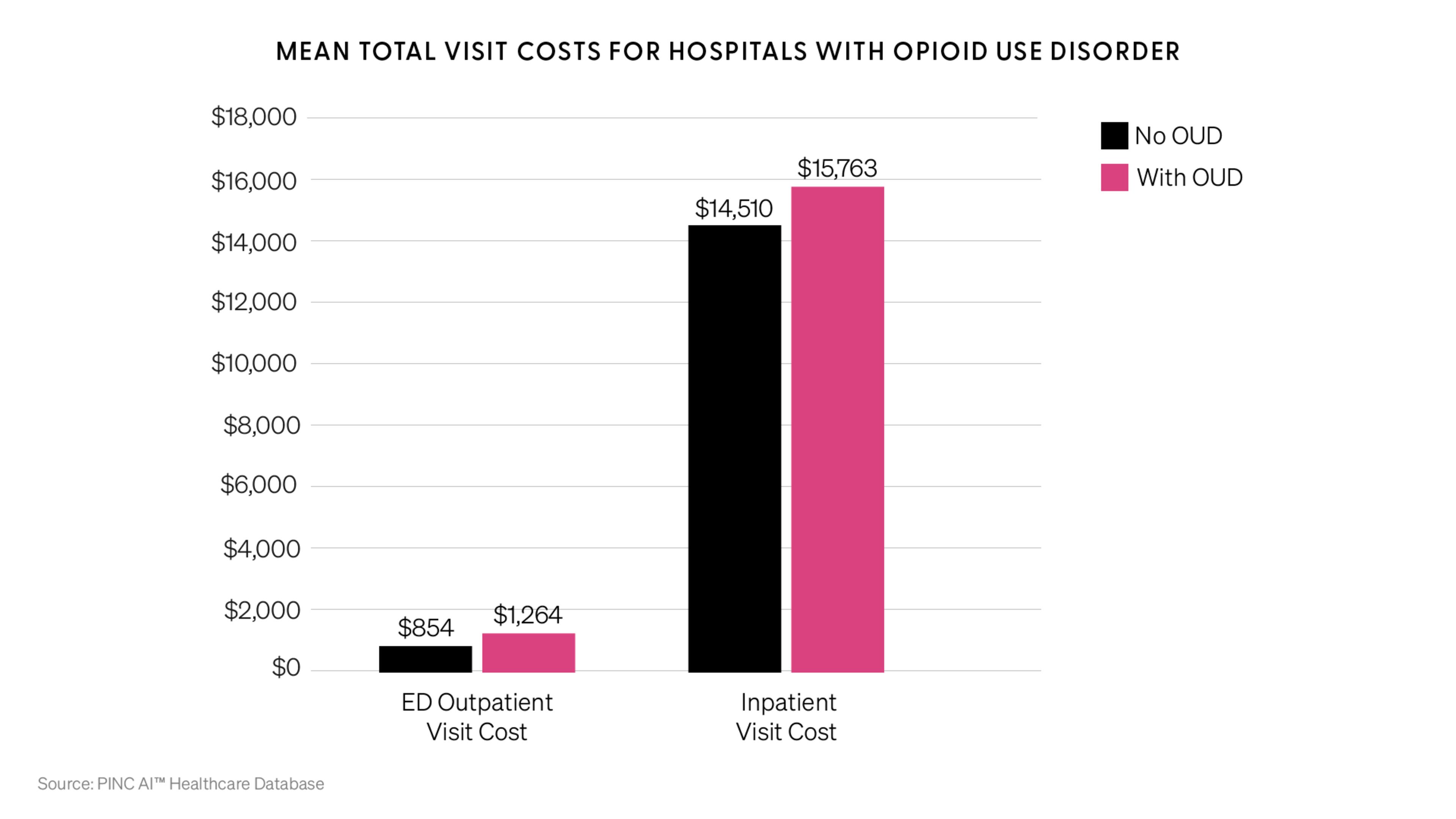 - Patients with an OUD diagnosis had 32.5 percent higher cost per ED visit and 8 percent higher cost per inpatient visit than those without an OUD diagnosis.