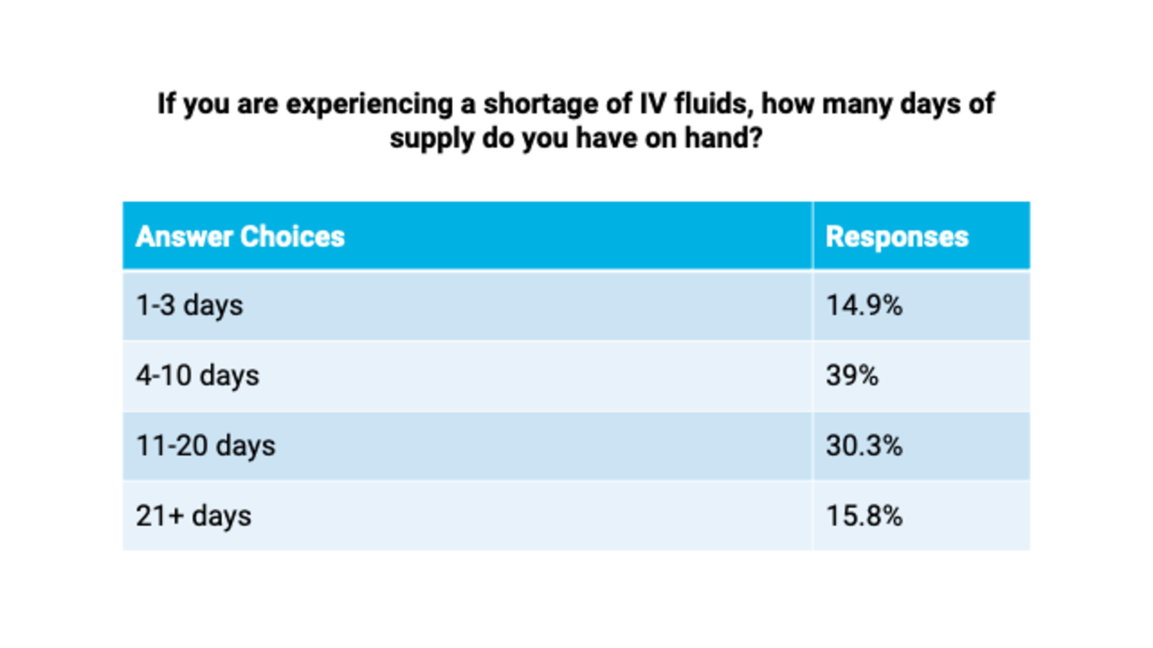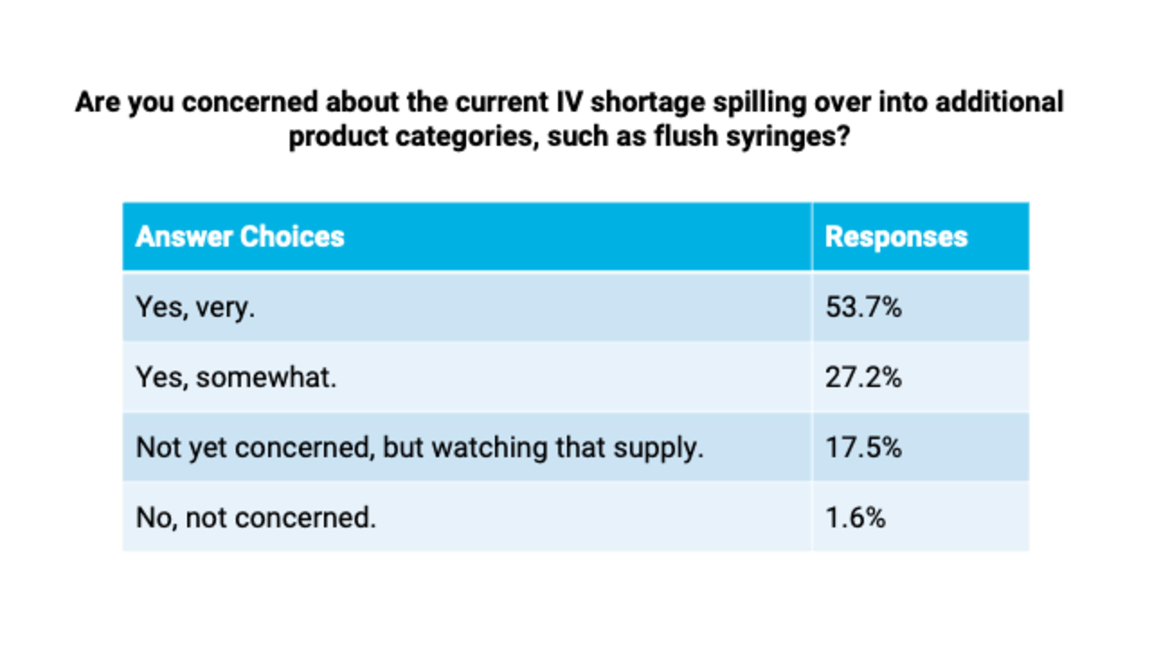 Should the market experience back-to-back events compromising the production capabilities of the two largest IV fluids manufacturers, more than 80 percent of provider respondents said they were concerned that shortages could exacerbate and spill over into other product categories, such as flush syringes, sterile water, IV bags and tubing, oral hydration solutions and other supplies used in daily patient care.